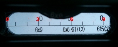 Die Abstände zwischen den Markierungen 0 - 3, 3 - 6, und 6 - 9 entsprechen jeweils einem Viertel der 6x6 Bildbreite. Zwischen 0 und bis die nächste Bildnummer bei 9 erscheint, liegt ebenfalls ein Viertel der Bildbreite. Da das Fenster in der Mitte des Film-Rückpapieres sitzt (wo die Bildnummern für 6x6 aufgedruckt sind), muss für das nächste 6x6 Bild die folgende Bildnummer auf derselben Position stehen. Der Abstand zwischen zwei 6x9 Bildern ist das 1,5 fache des 6x6 Abstandes, zwischen zwei 6x12 Bildern liegt der zweifache Abstand. Die